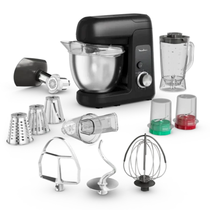 - Kit de 5 accessoires polyvalents : un blender de 1.25 L, une râpe, un broyeur, un hachoir et bien plus