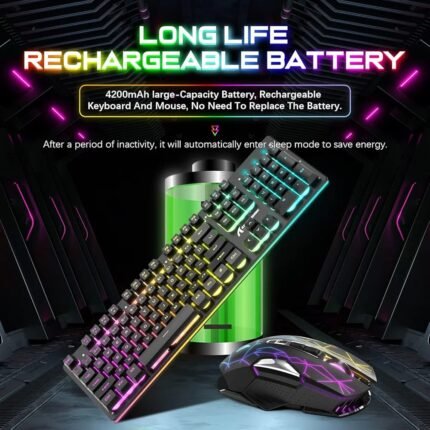 - 🔋【BUILT-IN LONG-LASTING RECHARGEABLE 4200mAh BATTERY】The keyboard is equipped with a 3200 mAh battery, and the mouse is equipped with an 1000 mAh battery. The built -in long -life rechargeable batteries avoids the trouble of replacing the battery. Note: Before using it for the first time, please charge for the keyboard mouse.