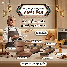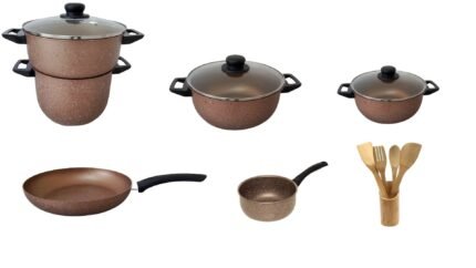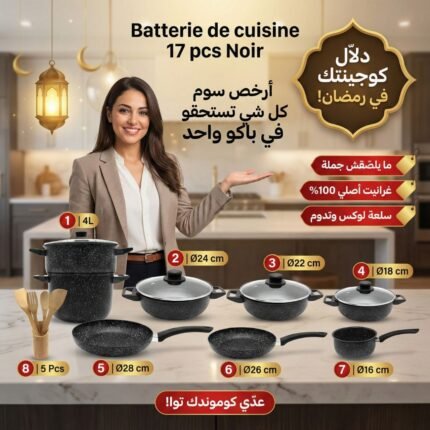 Description Courte : Transformez votre expérience culinaire avec ce pack tout-en-un de 17 pièces. Conçue pour les familles tunisiennes, cette batterie de cuisine en revêtement aspect granite allie élégance, robustesse et praticité. Le couscoussier inclus en fait le choix idéal pour vos repas de Ramadan et du quotidien.