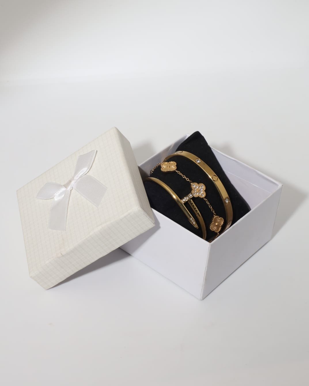 Le produit est un ensemble de bracelets élégants pour femme, de couleur dorée, présenté dans une boîte cadeau raffinée de couleur blanche, avec un intérieur noir qui met bien en valeur les bijoux.