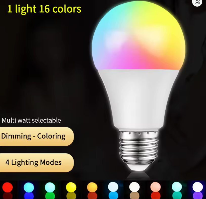 L’image présente une ampoule LED intelligente avec une base de type E27, capable d’afficher 16 couleurs différentes. Ce type d’ampoule est conçu pour offrir un éclairage personnalisable et est souvent contrôlé par une télécommande, une application mobile, ou des assistants vocaux comme Amazon Alexa ou Google Assistant, en fonction du modèle.