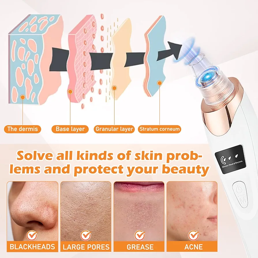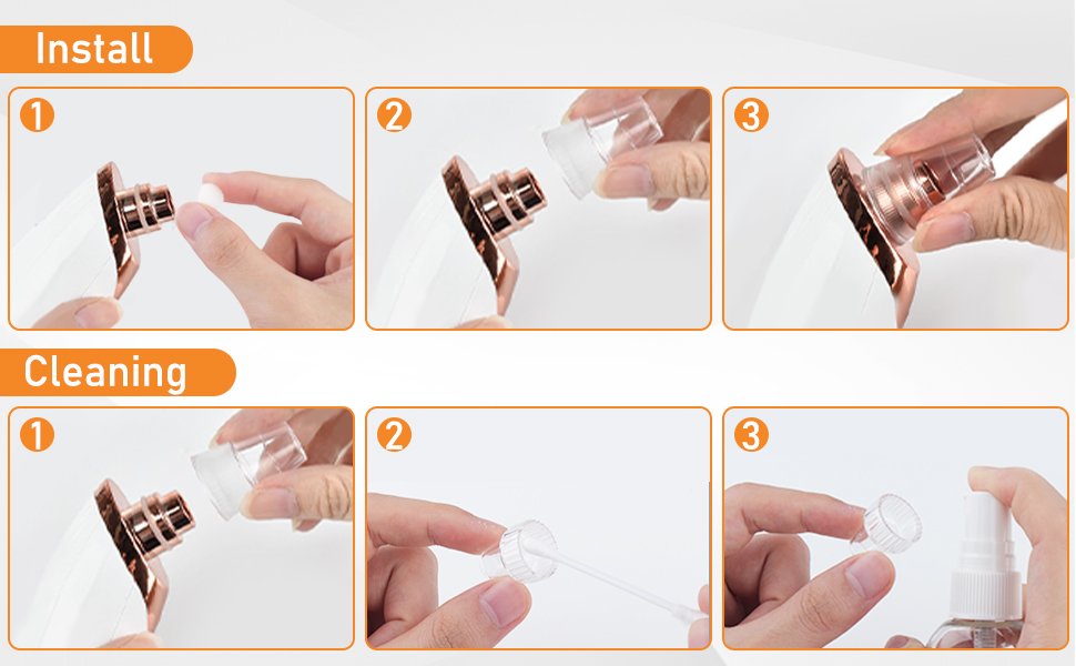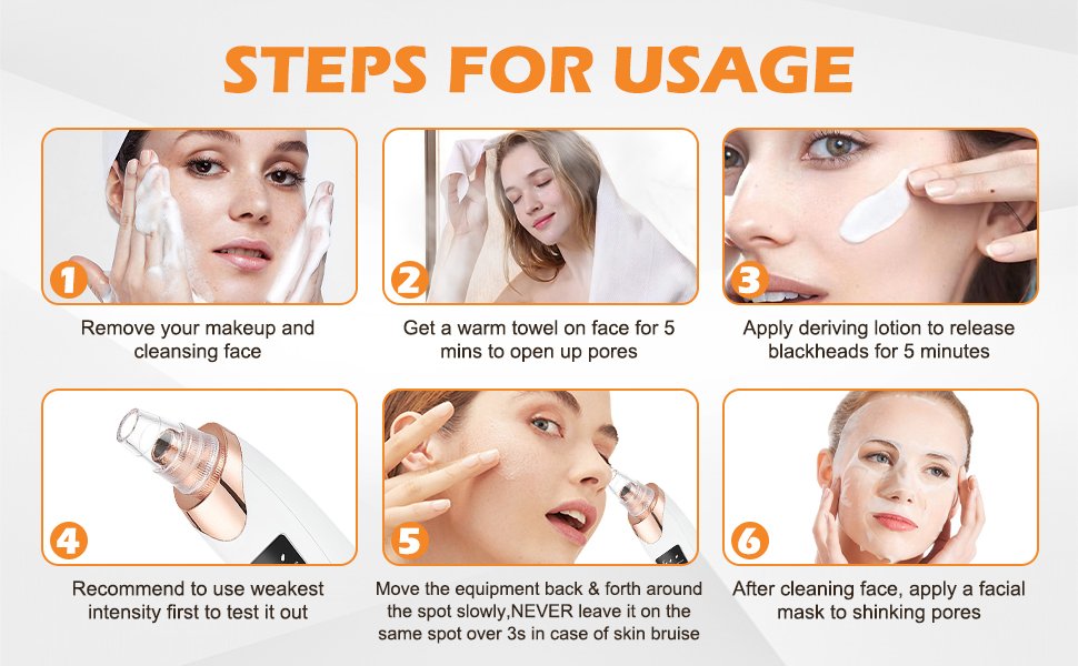 -Avant utilisation: après avoir pris un bain chaud ou transpiré, assurez-vous que vos pores sont complètement ouverts et gardez votre visage humide. 2, utilisation: déplacez lentement le produit d’avant en arrière sur la peau, ne restez pas au même endroit trop longtemps, afin de ne pas endommager la peau. Peut aspirer la graisse, les points blancs, l’acné et les points noirs plus légers. Si les points noirs sont profonds, il est préférable de les utiliser avec l’extracteur de points noirs! Peu importe s’il ne aspire pas une fois, ne l’utilisez pas trop longtemps à chaque fois, utilisez-le pendant une ou deux semaines, les points noirs plus sombres sortent, et il n’y aura pas de cicatrice. 3. Après utilisation, vous pouvez utiliser du toner ou de l’eau froide pour rétrécir les pores et faire un entretien ultérieur.