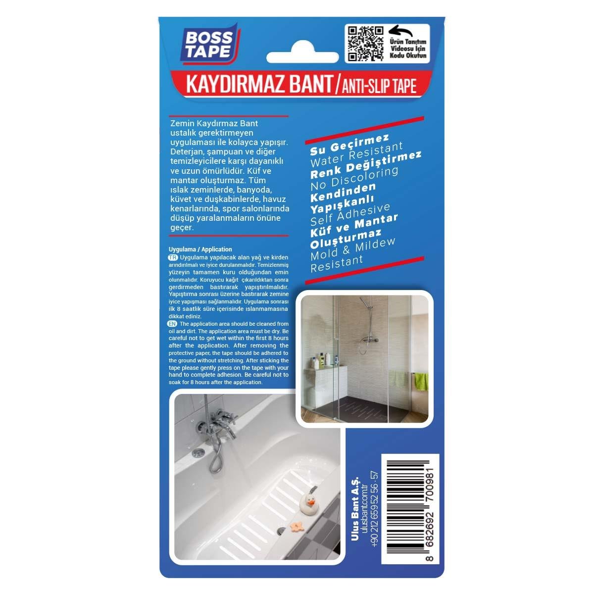 Le **Ruban Antidérapant pour Salle de Bain Boss Tape** contient 10 morceaux de rubans antidérapants avec fonction PVCP, parfaits pour une utilisation sur des surfaces présentant un risque de glisser, comme les gymnases, les douches, les baignoires et les bords de piscine.