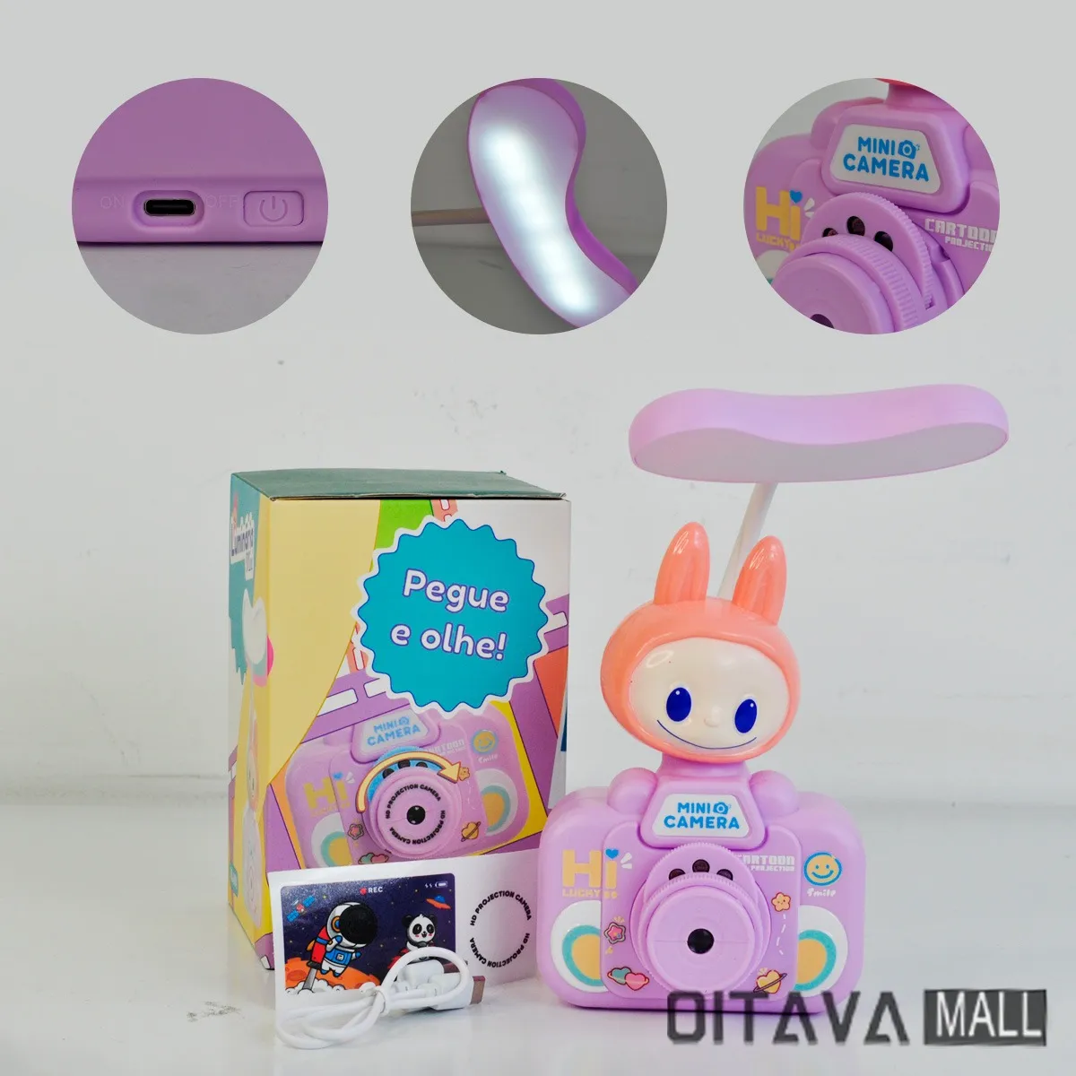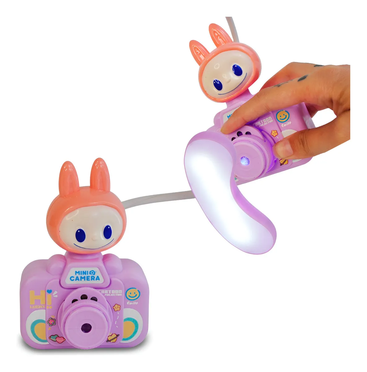 une mini caméra jouet rose avec un projecteur intégré, sur le thème de personnages de dessins animés (ressemblant à Kuromi et My Melody).