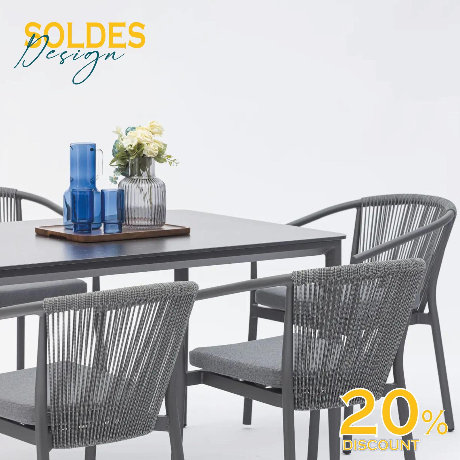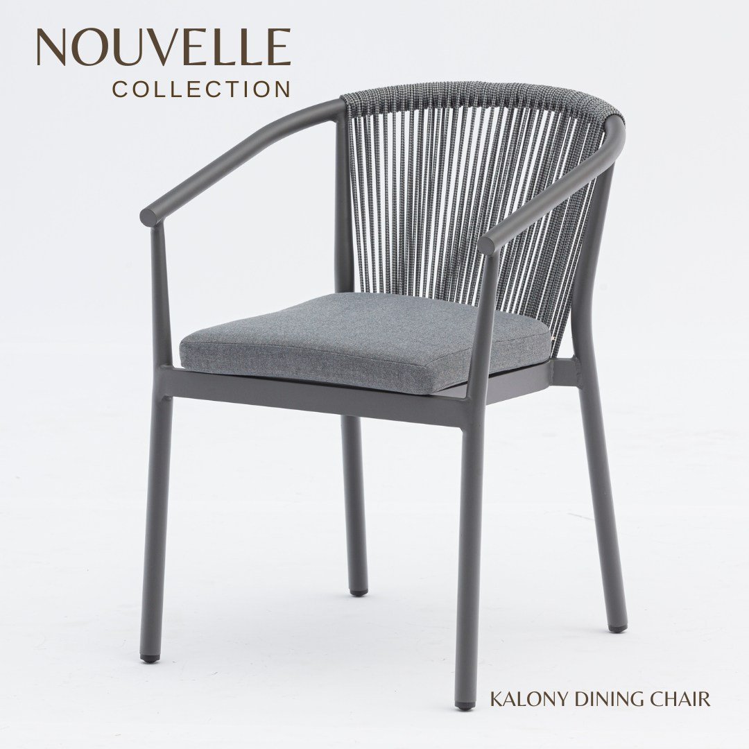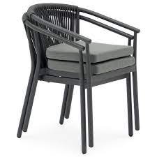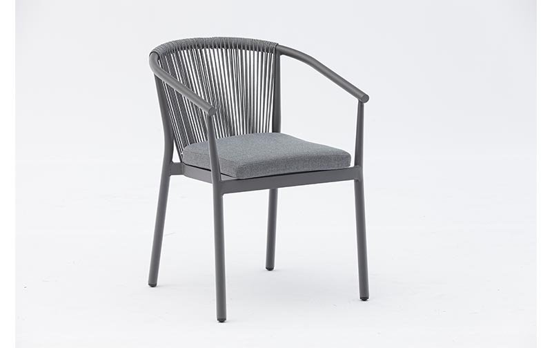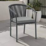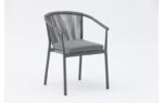 Chaise de salle à manger Moana. Structure en aluminium laqué anthracite, combinée avec une corde en oléfine gris anthracite. Coussin d’assise (5 cm) couleur gris moyen.