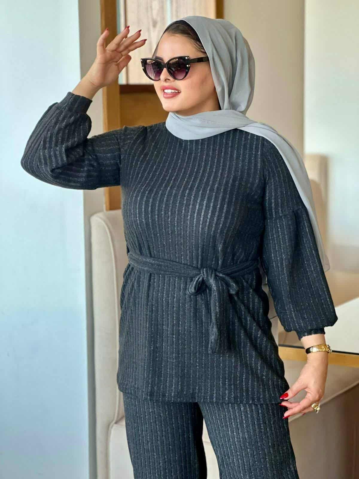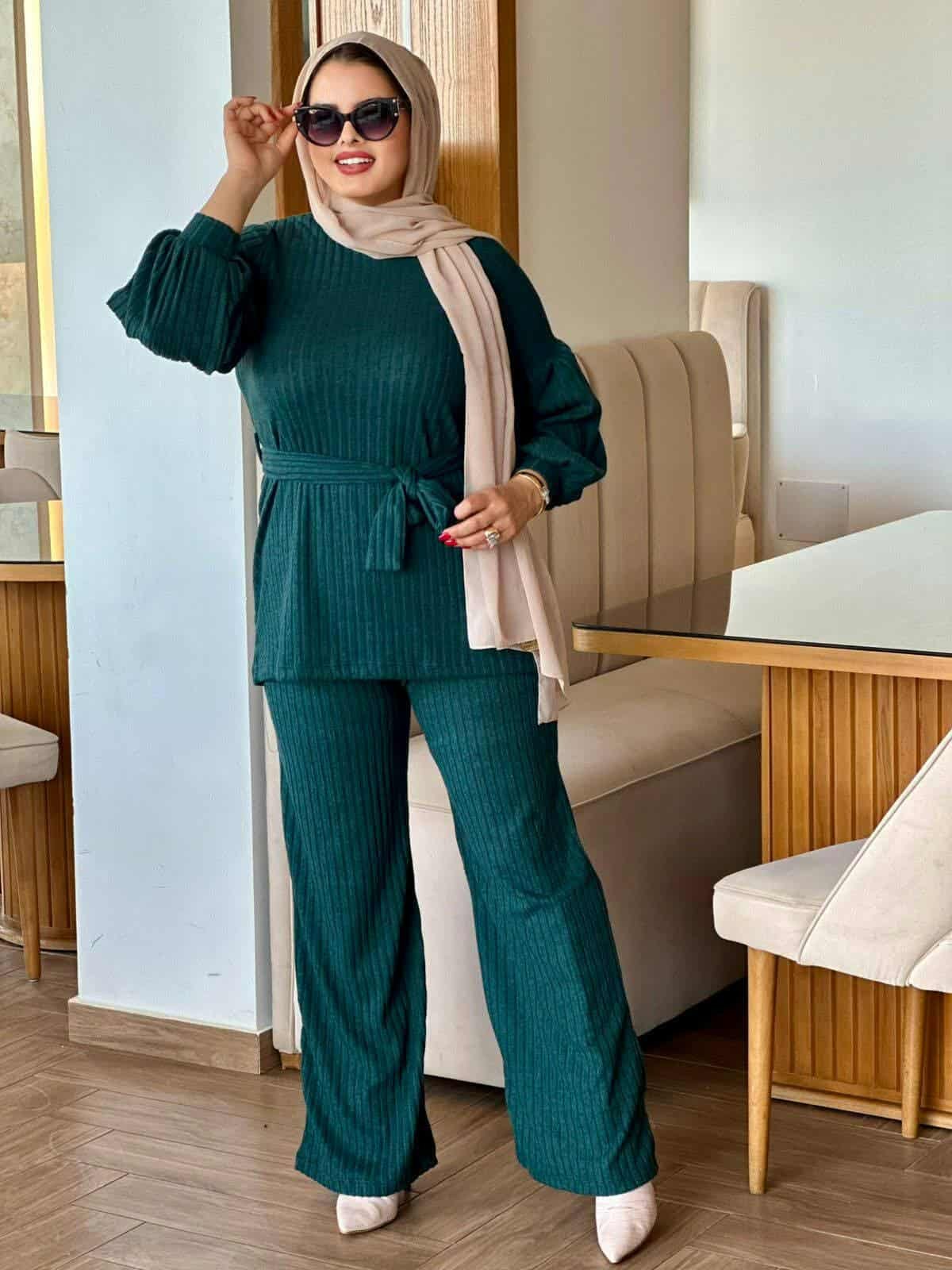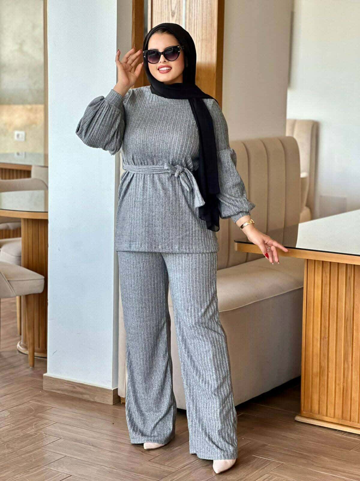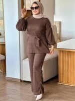 ÉlémentDescriptionHaut (Tunique/Pull)Col rond, coupe longue et fluide, manches bouffantes avec poignets resserrés. Ceinture assortie à nouer pour marquer la taille.Bas (Pantalon)Coupe droite large (ou légèrement évasée), élastique et confortable, assurant une liberté de mouvement totale.MatièreMaille côtelée épaisse, douce et extensible.CouleurBordeaux Profond / Aubergine (Couleur riche, idéale pour un look sophistiqué).StyleModeste, élégant et adapté au quotidien ou aux sorties décontractées.