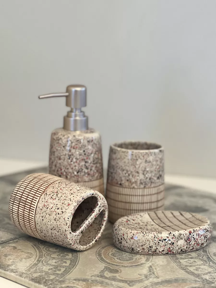 Transformez votre salle de bain en un havre de détente et de raffinement grâce à cet ensemble d’accessoires en céramique.