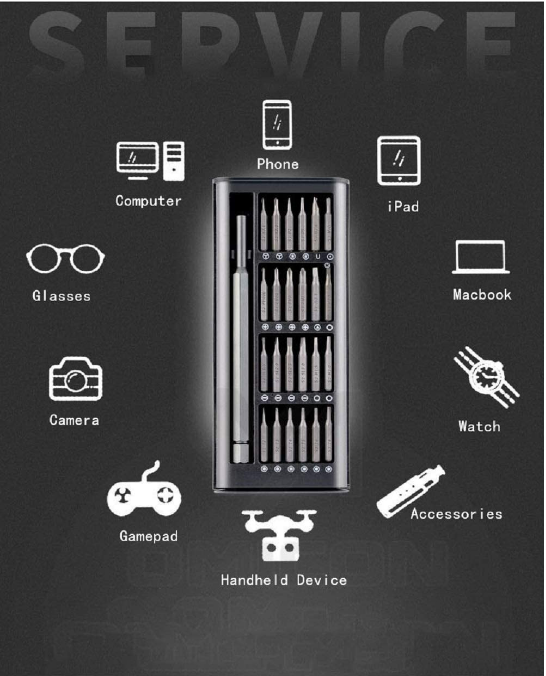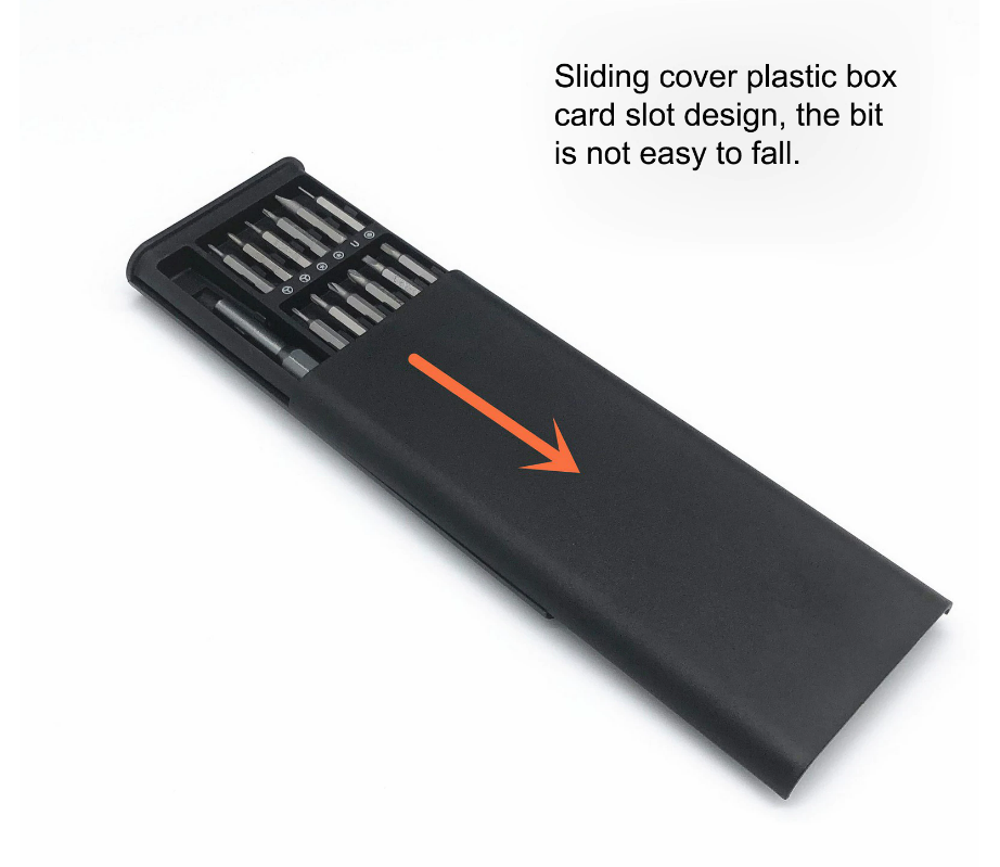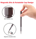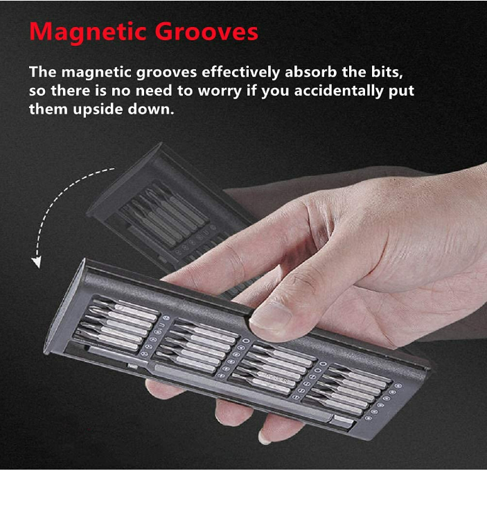 Ce mini ensemble de tournevis comprend 24 têtes d’embouts de précision magnétiques en acier allié S2 pour répondre à tous vos besoins, tels que la réparation de montres, de lunettes, de téléphones portables, d’appareils photo, de radios, d’ordinateurs, etc. La poignée du tournevis est dotée d’aimants puissants intégrés pour une installation et un remplacement faciles des embouts. La poignée du mini jeu de tournevis est en alliage d’aluminium avec un traitement antidérapant moleté qui s’adapte facilement à votre doigt et procure une sensation de main confortable. Le capuchon rotatif humanisé à 360 ° ne broie pas les mains après un travail de longue durée. Le mini étui à tournevis aide à maintenir toutes les vis en place afin qu’elles ne tombent pas.