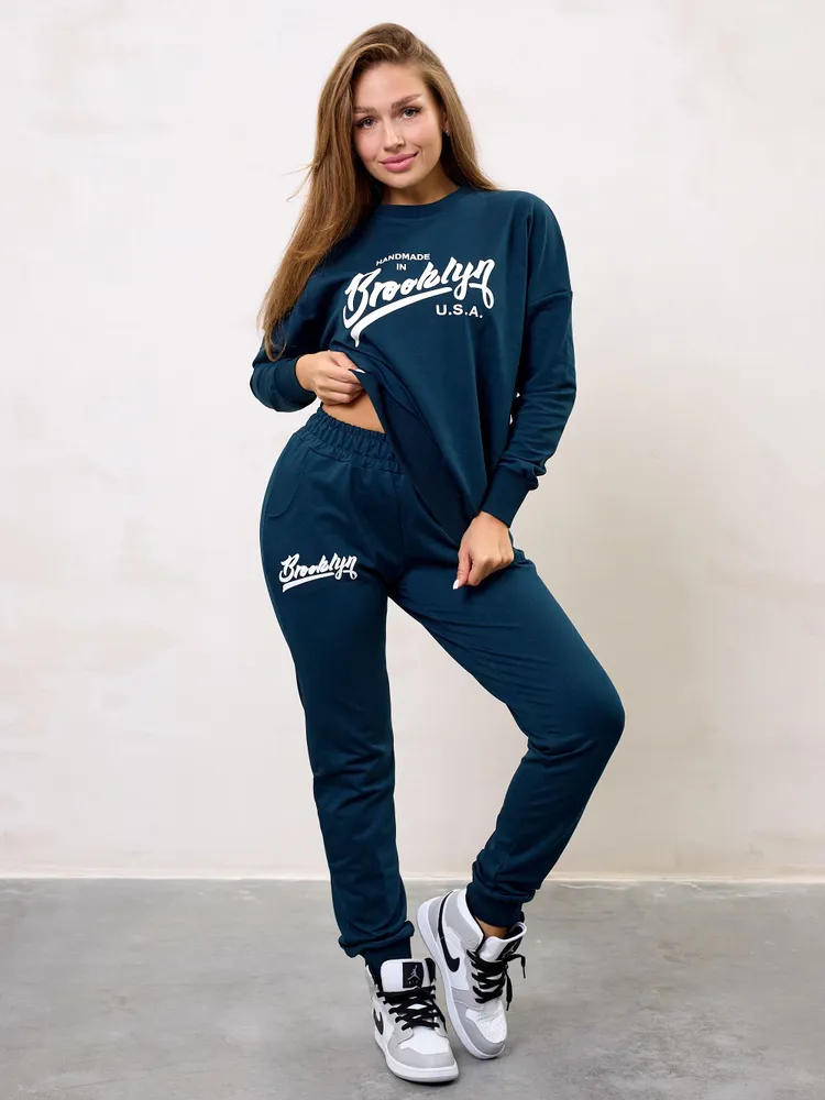 Le pantalon de jogging assorti, également bleu marine, possède une taille élastique, des chevilles resserrées et le mot Brooklyn imprimé sur la cuisse, pour un style coordonné, tendance et urbain, idéal pour les moments de détente ou les sorties décontractées.
