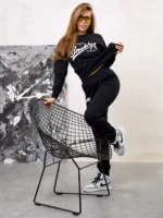 Ensemble jogging femme en deux pièces, composé d’un pantalon et d’un pull en tissu molletonné non gratté 100 % coton, doux et confortable.