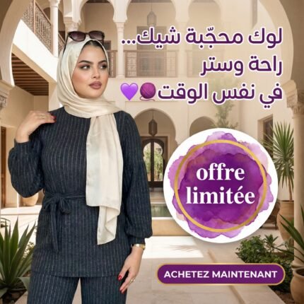 ÉlémentDescriptionHaut (Tunique/Pull)Col rond, coupe longue et fluide, manches bouffantes avec poignets resserrés. Ceinture assortie à nouer pour marquer la taille.Bas (Pantalon)Coupe droite large (ou légèrement évasée), élastique et confortable, assurant une liberté de mouvement totale.MatièreMaille côtelée épaisse, douce et extensible.CouleurBordeaux Profond / Aubergine (Couleur riche, idéale pour un look sophistiqué).StyleModeste, élégant et adapté au quotidien ou aux sorties décontractées.