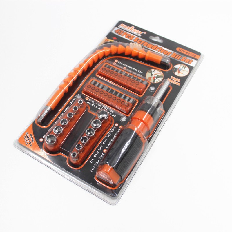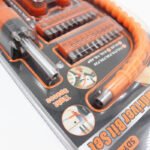 • Contenu : Le set comprend 43 pièces, incluant une poignée de tournevis, une rallonge flexible et une variété d’embouts.