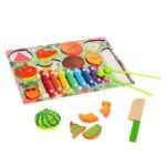 Le plateau de jeu est réalisé sous la forme d’un cadre d’insertion avec des fruits colorés. Les fruits en bois peuvent être divisés avec un couteau en bois et jouer au chef. Les produits sont reliés par des aimants, de sorte qu’ils peuvent être divisés et remontés un nombre infini de fois !