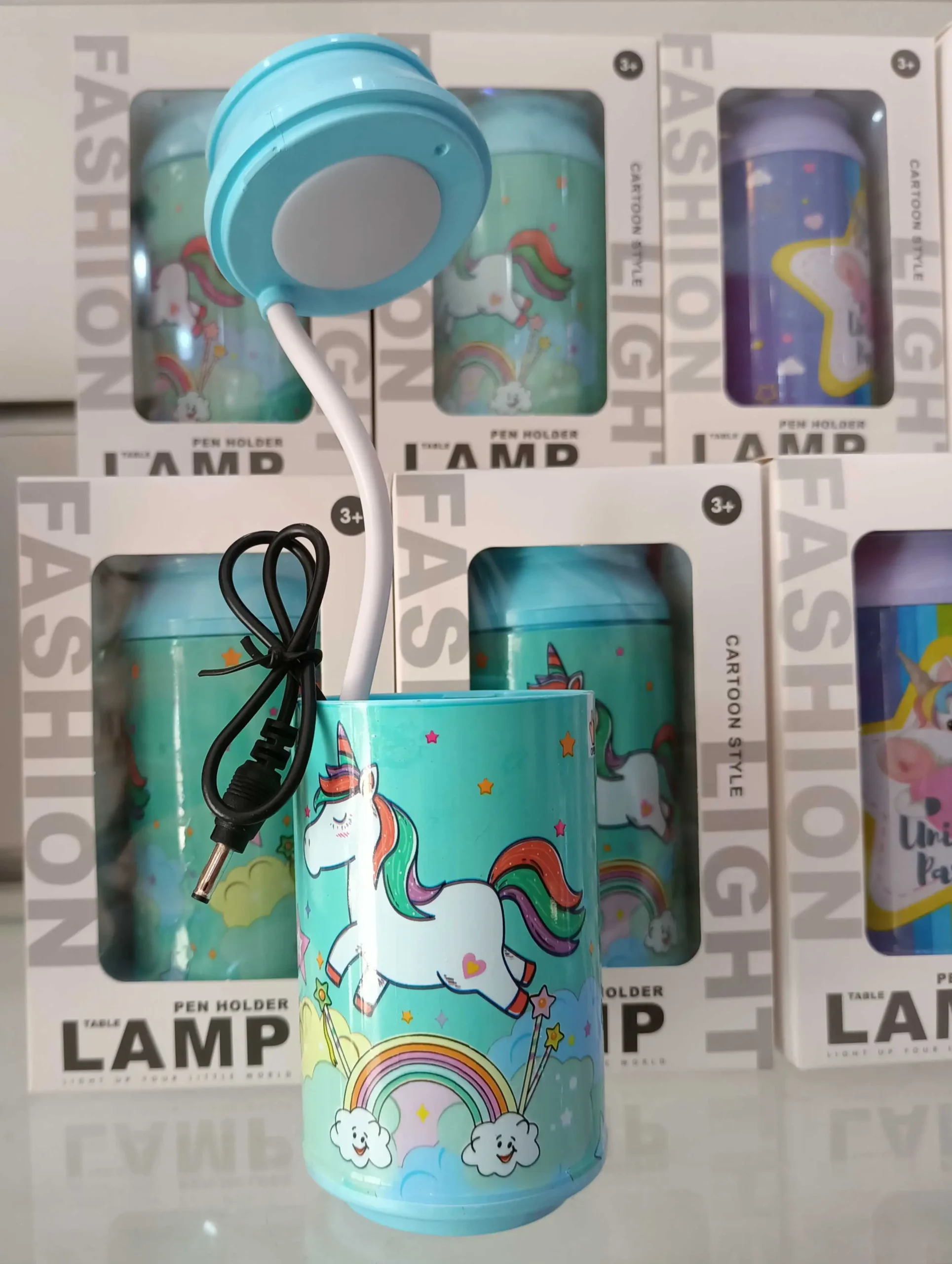 Veilleuse unicorn pour enfant et porte stylo, avec câble USB et batterie intégrée.