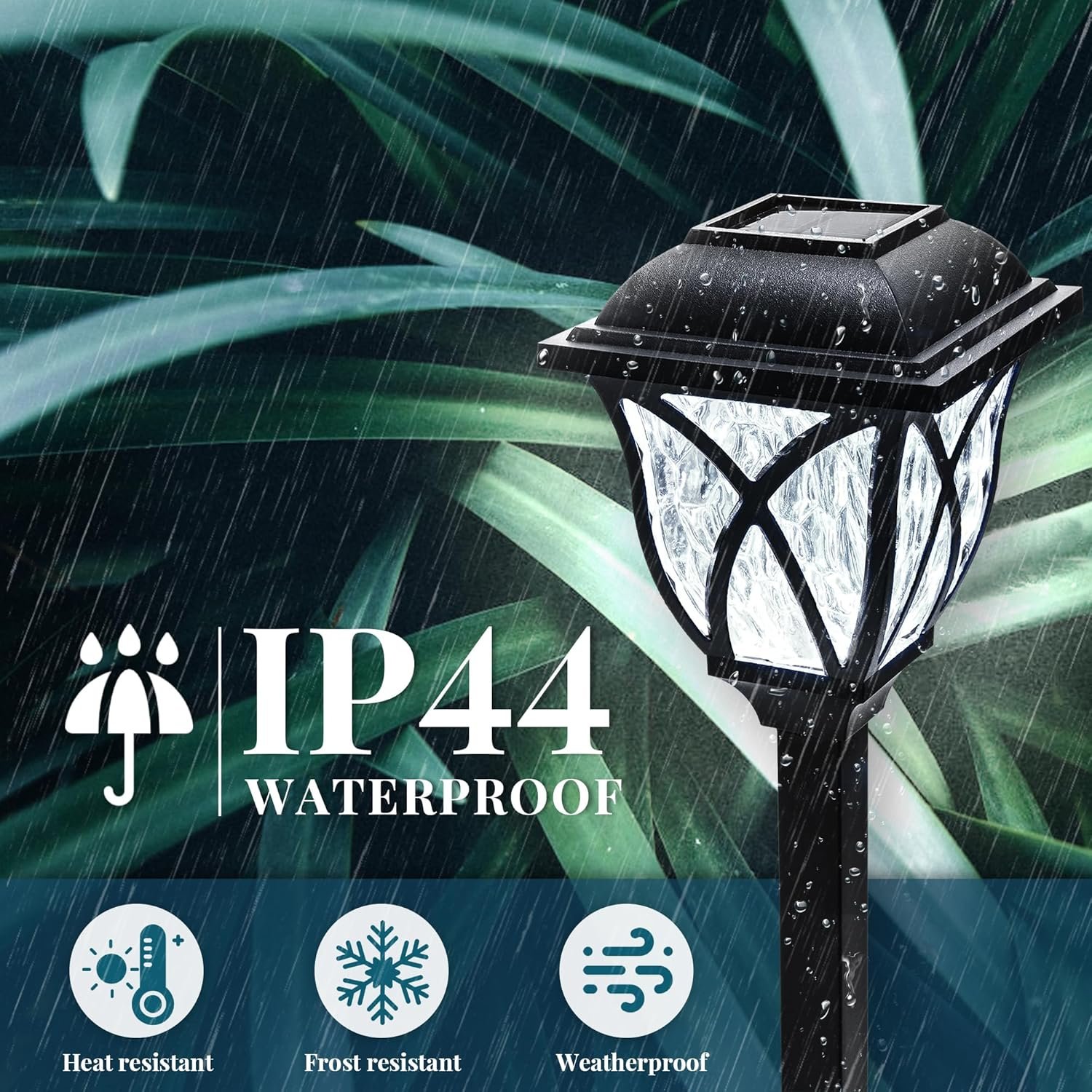 مصابيح الحديقة الشمسية هذه تأتي بتصميم أنيق يجمع بين الجمالية والصلابة، وهي مزوّدة بتقنية IP44 المقاومة للماء، مما يجعلها مثالية للاستخدام الخارجي طوال السنة. تتحمّل هذه المصابيح الأمطار الغزيرة، حرارة الصيف، وبرودة الشتاء بفضل مقاومتها للحرارة والصقيع والظروف الجوية المختلفة. تعمل بالطاقة الشمسية بالكامل، مما يوفّر عليك التكاليف ويضمن إضاءة تلقائية عند حلول الظلام دون الحاجة لأي تدخل يدوي. كما تم تصميم الغطاء الزجاجي بنقشة مميزة تعكس الضوء بشكل جميل، ما يمنح حديقتك أو ممرّك مظهراً فاخراً. سهلة التركيب بفضل الدعامة الأرضية، وتقدّم إضاءة قوية وواضحة تضيف الأمان والجاذبية لمساحتك الخارجية.