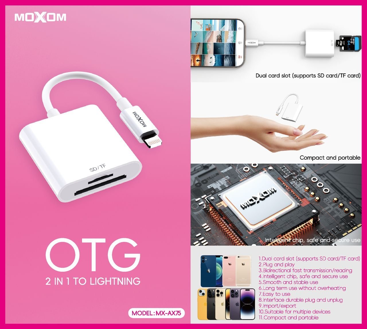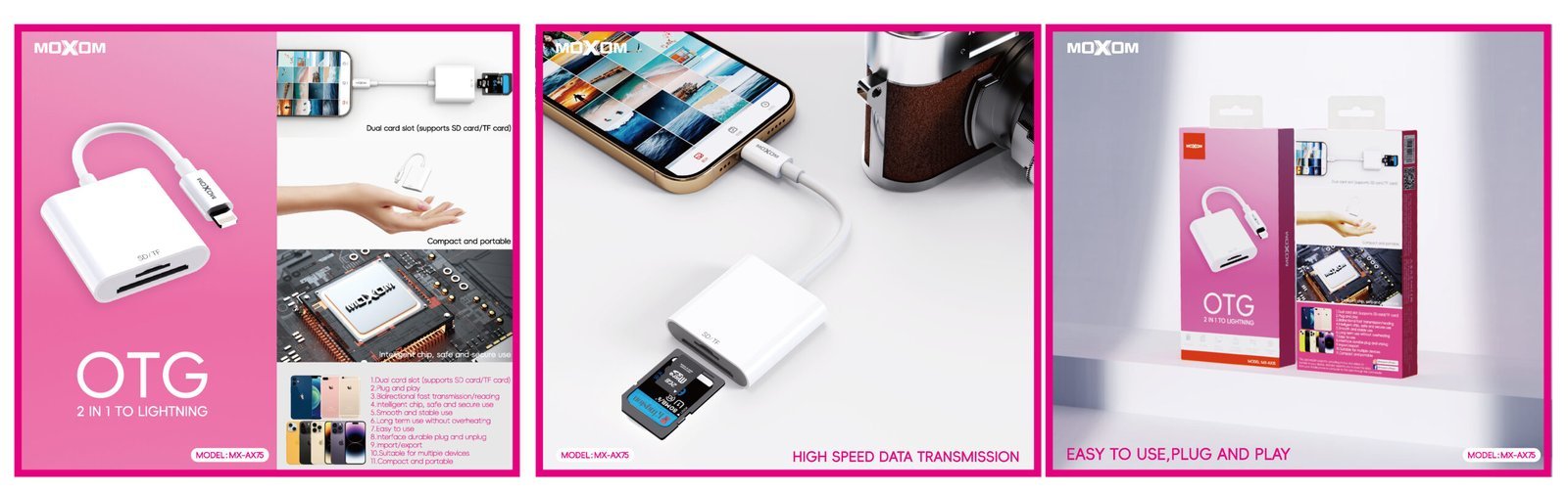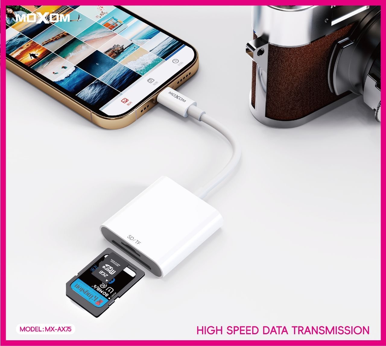 Pour les photographes, les créateurs de contenu et les voyageurs ! Dites adieu à l’attente du retour à l’ordinateur. Avec le lecteur de cartes MOXOM MX-AX75, importez vos photos professionnelles et vos vidéos haute résolution directement sur votre iPhone ou iPad avec une rapidité et une simplicité inégalées. Partagez vos meilleurs clichés sur les réseaux sociaux ou commencez à les éditer instantanément.