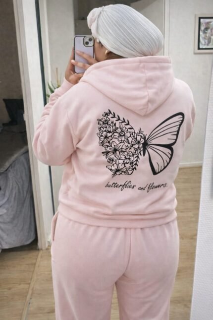- Design : Il comporte l'inscription manuscrite « butterflies and flowers » sous le graphique central. C'est un modèle de style décontracté avec une coupe régulière.