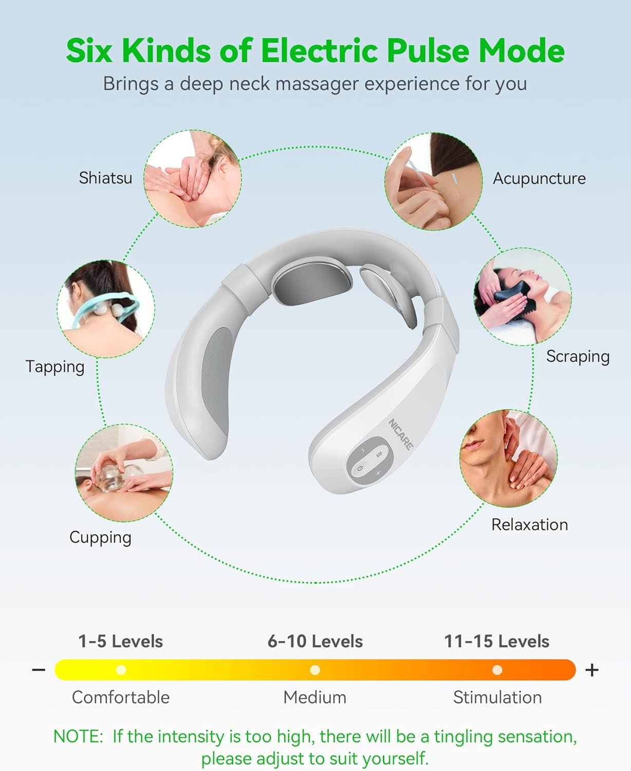 • Relaxation du cou : ce masseur de cou intelligent utilise des impulsions électriques transmises à la peau profonde et utilise des impulsions électriques simulant une variété de massages pour obtenir une relaxation profonde de la colonne cervicale. En raison de l’utilisation de la thérapie par impulsions électriques, lorsque vous utilisez le masseur, vous pouvez ressentir un choc électrique. C’est normal, il peut détendre les muscles plus profondément que le massage traditionnel.