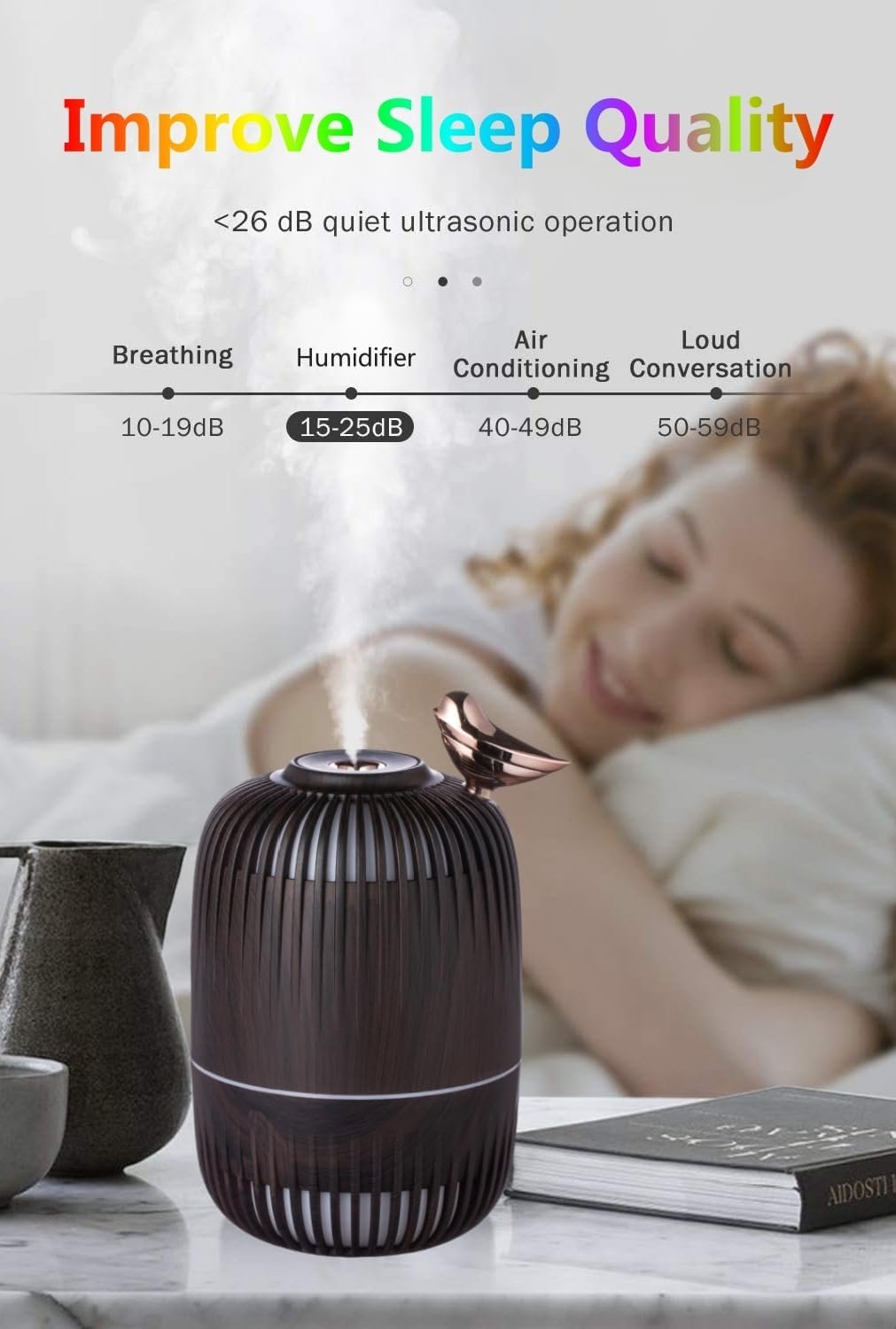- Fonctionnalités Supplémentaires : Il est équipé d’une veilleuse LED douce pour créer une atmosphère relaxante, d’une fonction d’arrêt automatique lorsque le niveau d’eau est bas, et est alimenté par USB pour une utilisation pratique.