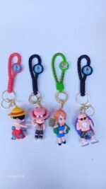 L’image présente une collection de quatre porte-clés inspirés de l’anime “One Piece”, chacun représentant un personnage distinct de la série.
