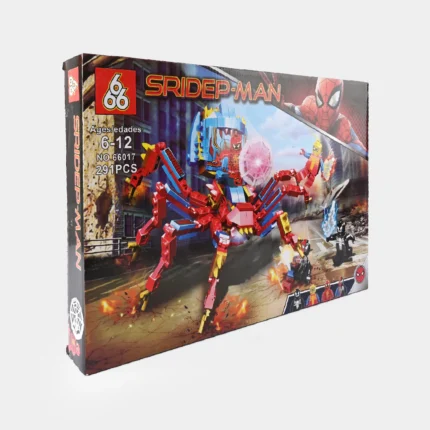 - Contenu : L'image montre un grand robot araignée rouge et bleu à construire, ainsi que plusieurs figurines de personnages (Spider-Man classique, une version jaune et bleue, et une version noire).