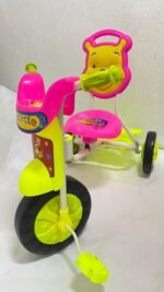 - Design Winnie l’Ourson : Le tricycle est principalement jaune et vert, avec un dossier de siège en forme de tête de Winnie l’Ourson et des autocollants de Winnie l’Ourson sur le cadre avant.