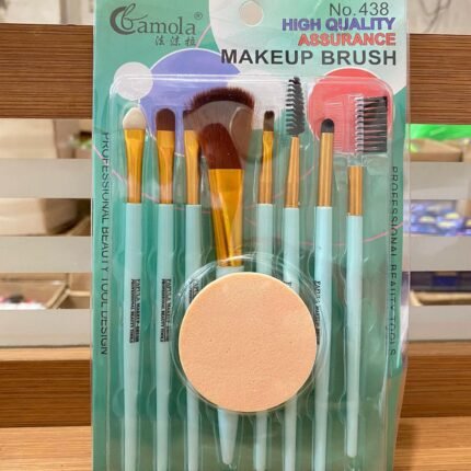 - Contenu : Un ensemble de plusieurs pinceaux de maquillage (au moins six pièces visibles, y compris un gros pinceau ovale et divers petits pinceaux pour les yeux et un peigne/brosse double face)